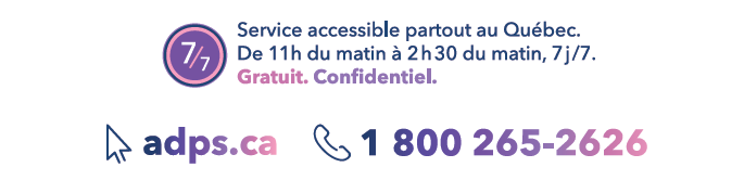 Grâce à ADPS, il est possible de bénéficier d’un accompagnement par téléphone ou visioconférence avec un·e intervenant·e, qui pourra appeler les secours si des signes de surdose apparaissent. Confidentiel, bilingue, gratuit, le service est accessible partout au Québec, de 11 h à 2 h 30, en composant le 1 800 265-2626, option 2.