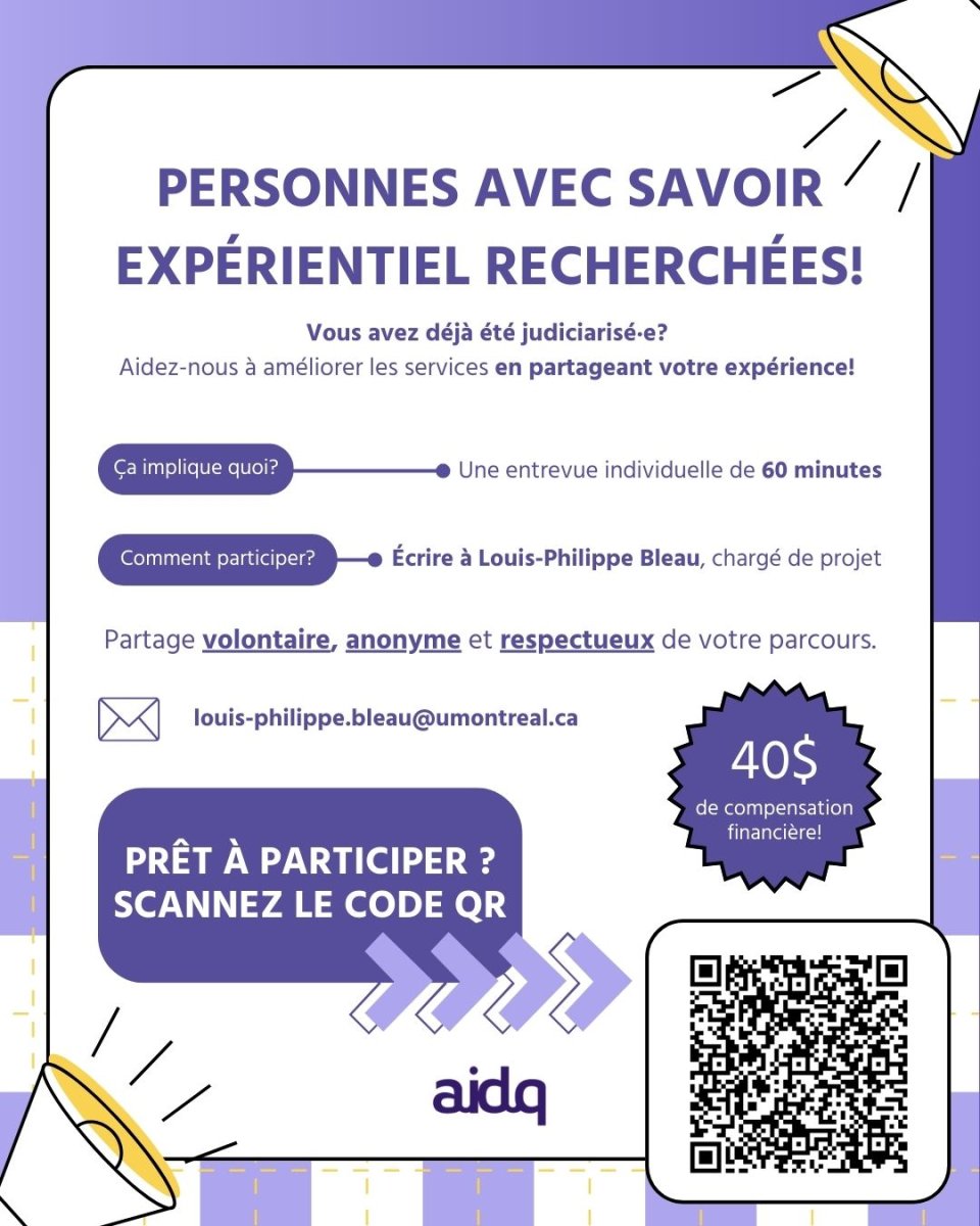 La participation consiste à prendre part à une entrevue individuelle d’environ 60 minutes avec le chargé de projet. Les échanges porteront notamment sur le parcours de consommation et judiciaire, les expériences vécues avec les services de santé et de RDM, ainsi que sur les idées et recommandations pour améliorer les pratiques actuelles.